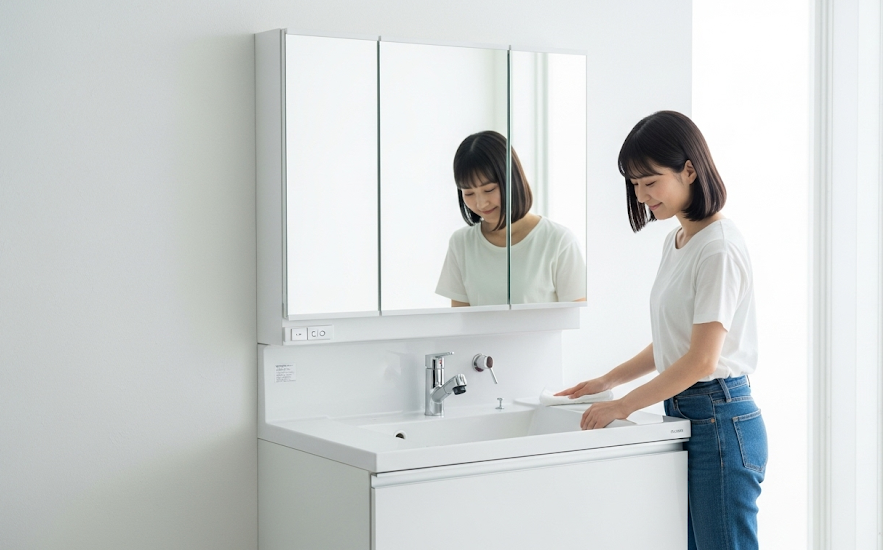 毎日の身支度や手洗い、洗濯などで頻繁に使う洗面化粧台も、使い勝手と清掃性が求められる重要な設備です。