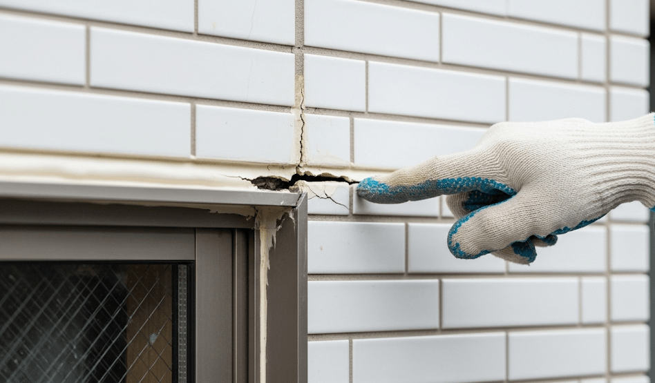 このコーキング材は、残念ながらタイルほど長寿命ではなく、紫外線や風雨の影響で10年程度で劣化し、ひび割れや硬化が進むのが一般的です。